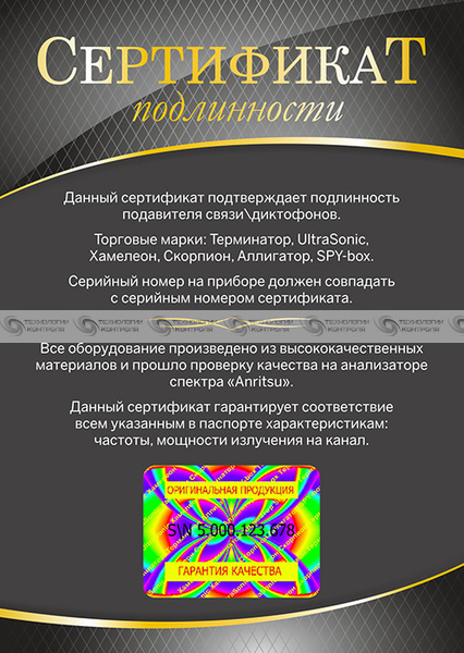ТОЛЬКО ОРИГИНАЛЬНАЯ ПРОДУКЦИЯ С ТОРГОВОЙ МАРКОЙ "ТЕРМИНАТОР", "АЛЛИГАТОР", "ГАРПИЯ" ИМЕЕТ ЗАЩИТНУЮ ГОЛОГРАММУ И СЕРТИФИКАТ ПОДЛИННОСТИ. ОТСУТСТВИЕ ОДНОГО ИЗ ЭТИХ ЭЛЕМЕНТОВ ГОВОРИТ О ТОМ, ЧТО ТОВАР ПОДДЕЛЬНЫЙ!